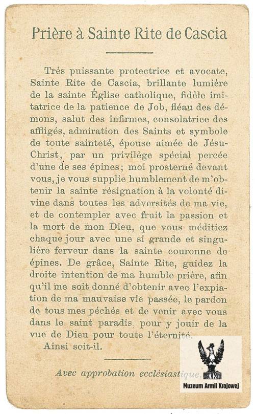Rycina oparta jna obrazie św. Rity przechowywanym w kaplicy klasztornej Augustianek w miejscowości Cascia (Umbria, Włochy). Przedstawia św. Ritę w momencie otrzymania stygmatów. Św. Rita w czarnym habicie zakonnym klęczy po prawej stronie obrazu, ręce ma skrzyżowane na piersi. Spogląda na krucyfiks umieszczony na klęczniku po lewej stronie obrazu. Strumień światła bijący od krucyfiksu pada na czoło Świętej w miejscu, gdzie znajduje się stygmat - cierń. U stóp krucyfiksu widnieje czaszka. Na podnóżku klęcznika leży dyscyplina. Ponad Świętą wśród chmur wznoszą się aniołki, jeden z nich trzyma wieniec, drugi różę, trzeci kiść winorośli, czwarty gałązkę figową. W lewym dolnym rogu ryciny napis: "Cav. [skrót od "cavavit" - "wygrawerował"] A. Marini", a w prawym dolnym rogu "Roma". Poniżej ryciny znajduje się napis: "Sainte Rite de Cascia de l'Ordre des Erémites de Saint'Augustin". Na odwrocie karty umieszczona jest modlitwa do św. Rity: "Priére a Sainte Rite de Cascia".