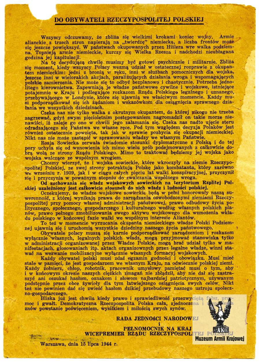 Ulotka konspiracyjna: Rada Jedności Narodowej, Pełnomocnik na Kraj - Wicepremier Rządu Rzeczypospolitej, oświadczenie