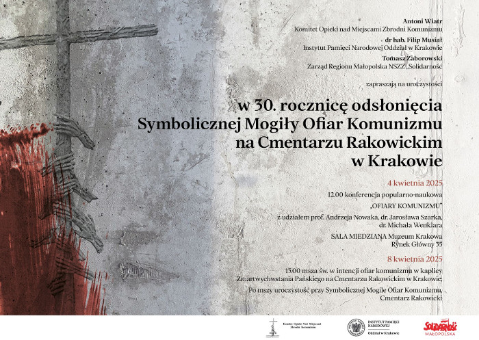 Serdecznie zapraszamy do wzięcia udziału w obchodach 30. rocznicy odsłonięcia Symbolicznej Mogiły Ofiar Komunizmu na Cmentarzu Rakowickim w Krakowie.