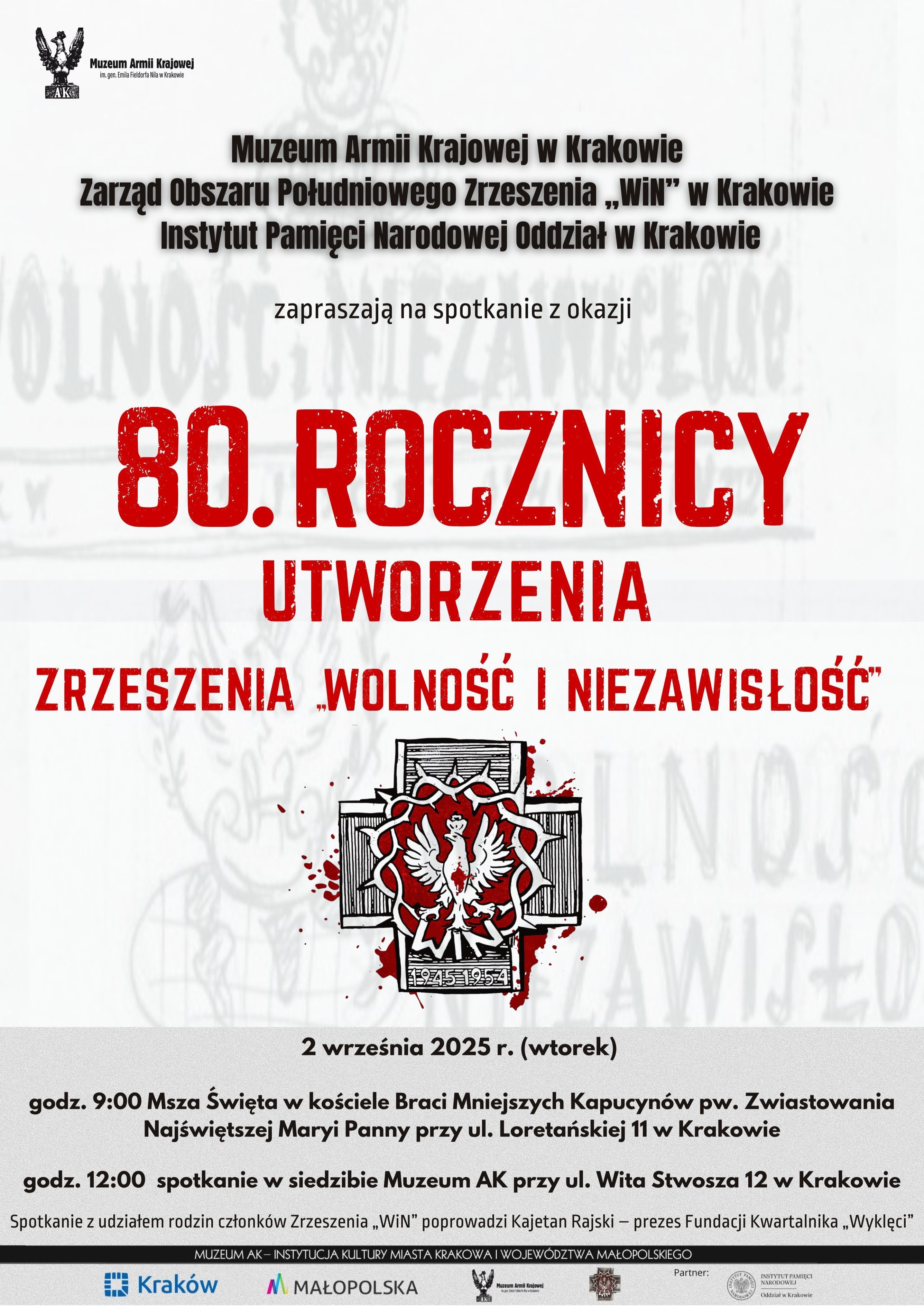 2 września 2025 r. Muzeum Armii Krajowej w Krakowie, Zarząd Obszaru Południowego Zrzeszenia "WiN" w Krakowie i krakowski oddział IPN zapraszają na spotkanie z okazji 80. rocznicy utworzenia Zrzeszenia "Wolność i Niezawisłość". Honorowy Patronat nad wydarzeniem objął Prezydent RP Karol Nawrocki.
