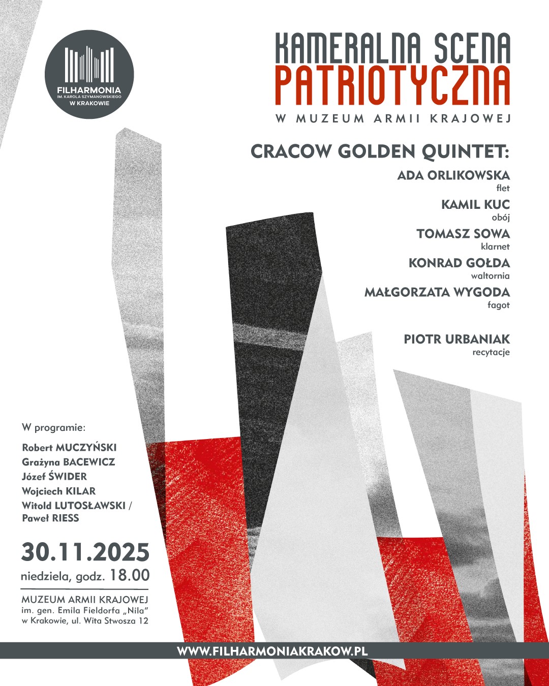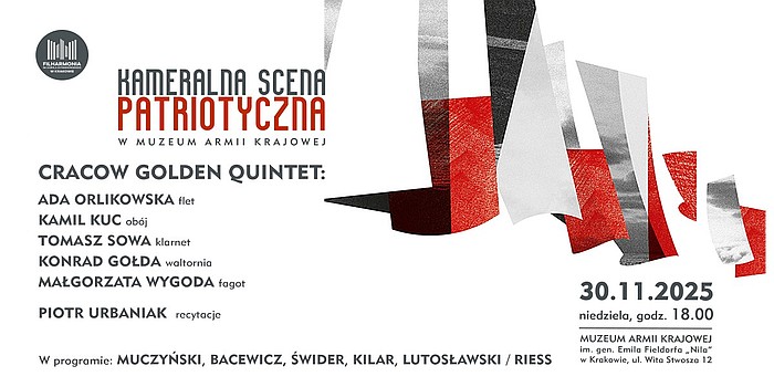 Muzeum AK i Filharmonia Krakowska zapraszają w niedzielę 30 listopada 2025 r. na kolejny koncert z cyklu Kameralna Scena Patriotyczna. Wystąpi Cracow Golden Quintet.