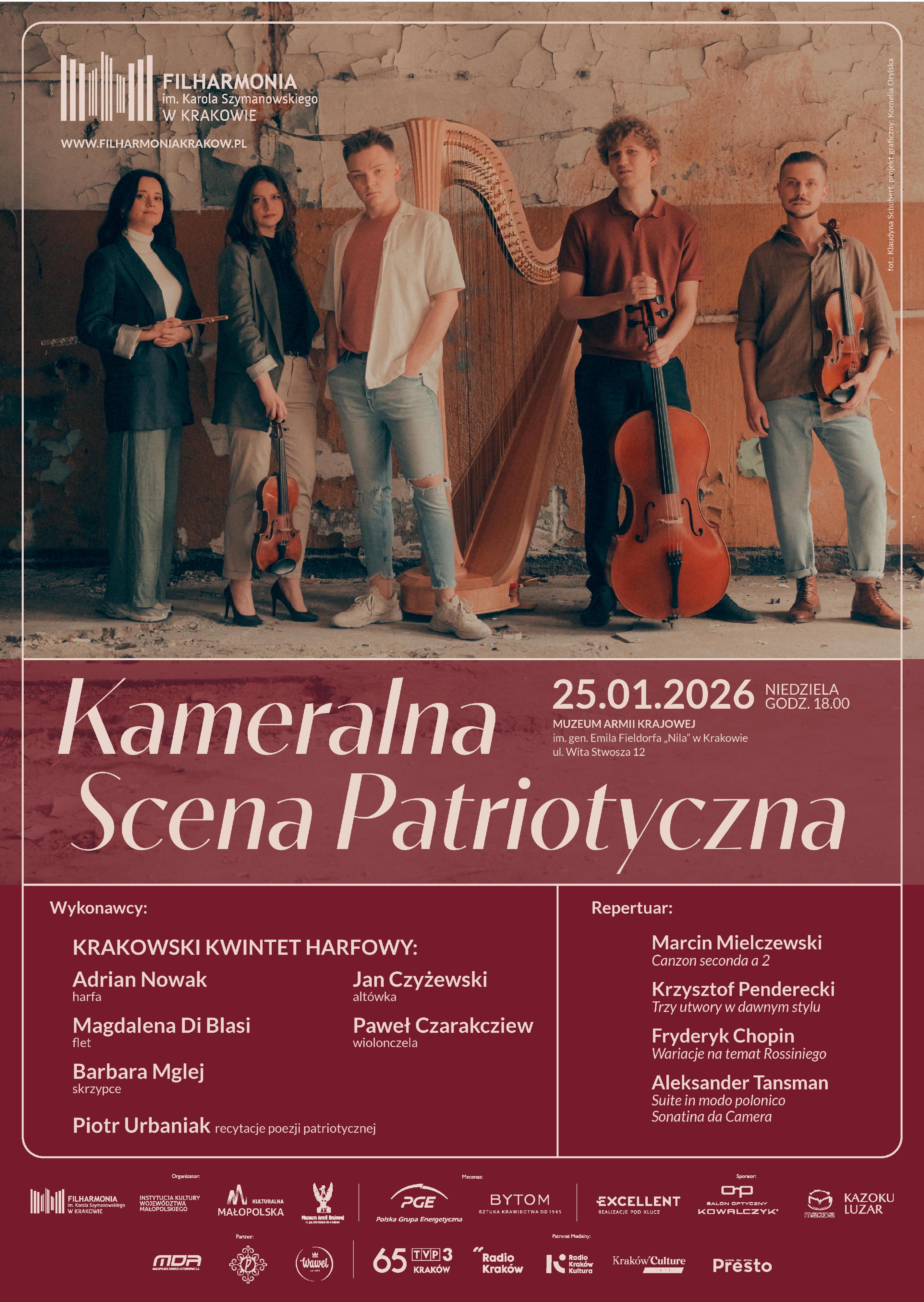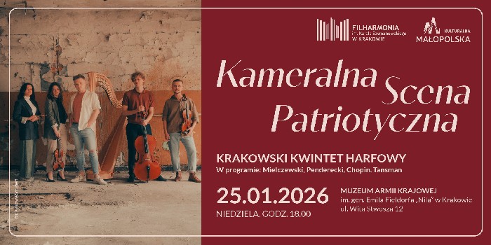 Muzeum AK i Filharmonia Krakowska im. Karola Szymanowskiego zapraszają w niedzielę 25 stycznia 2026 r. na kolejny koncert z cyklu Kameralna Scena Patriotyczna. Wystąpi Krakowski Kwintet Harfowy.