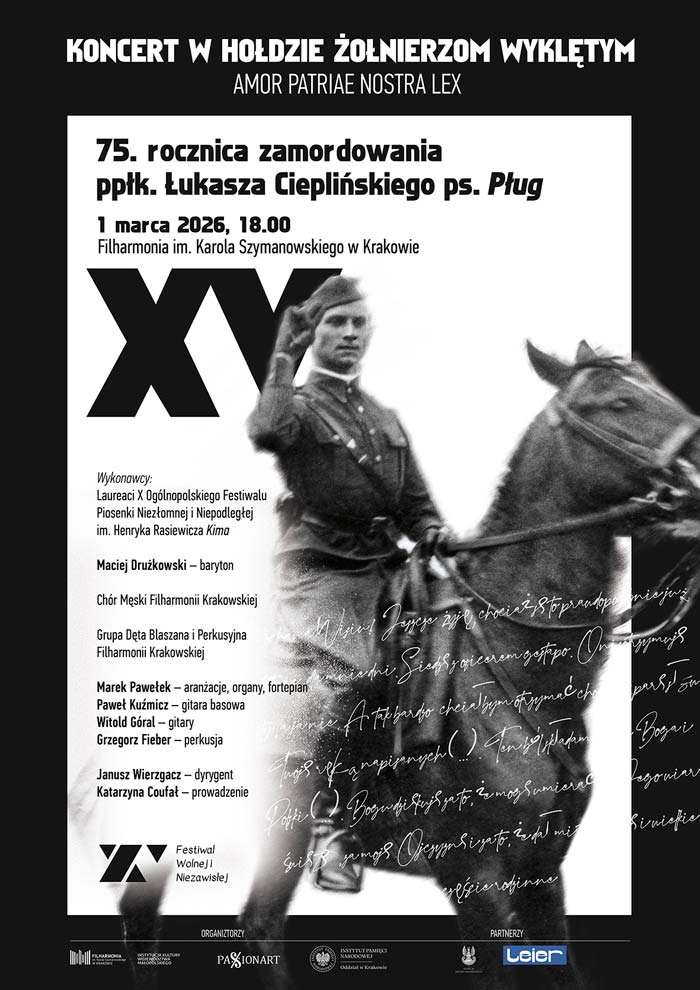 Zapraszam także na XV edycję uroczystego koncertu w hołdzie bohaterom powojennego podziemia niepodległościowego, organizowanego z okazji Narodowego Dnia Pamięci Żołnierzy Wyklętych. Koncert odbędzie się 1 marca 2026 r. w Filharmonii Krakowskiej, początek o godz. 18.00. Informacja o biletach na stronie Filharmonii Krakowskiej.