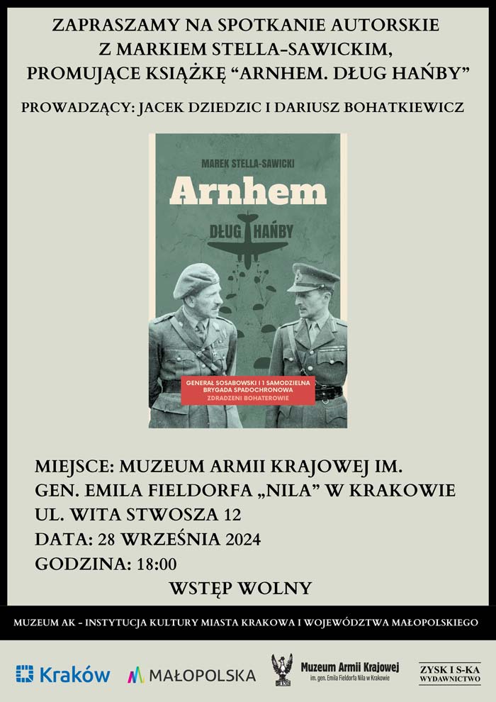 W sobotę 28 września 2024 r. Muzeum Armii Krajowej w Krakowie oraz wydawnictwo Zysk i S-ka zapraszają na spotkanie z dr. Markiem Stella-Sawickim, autorem wydanej właśnie książki "Arnhem. Dług hańby".
