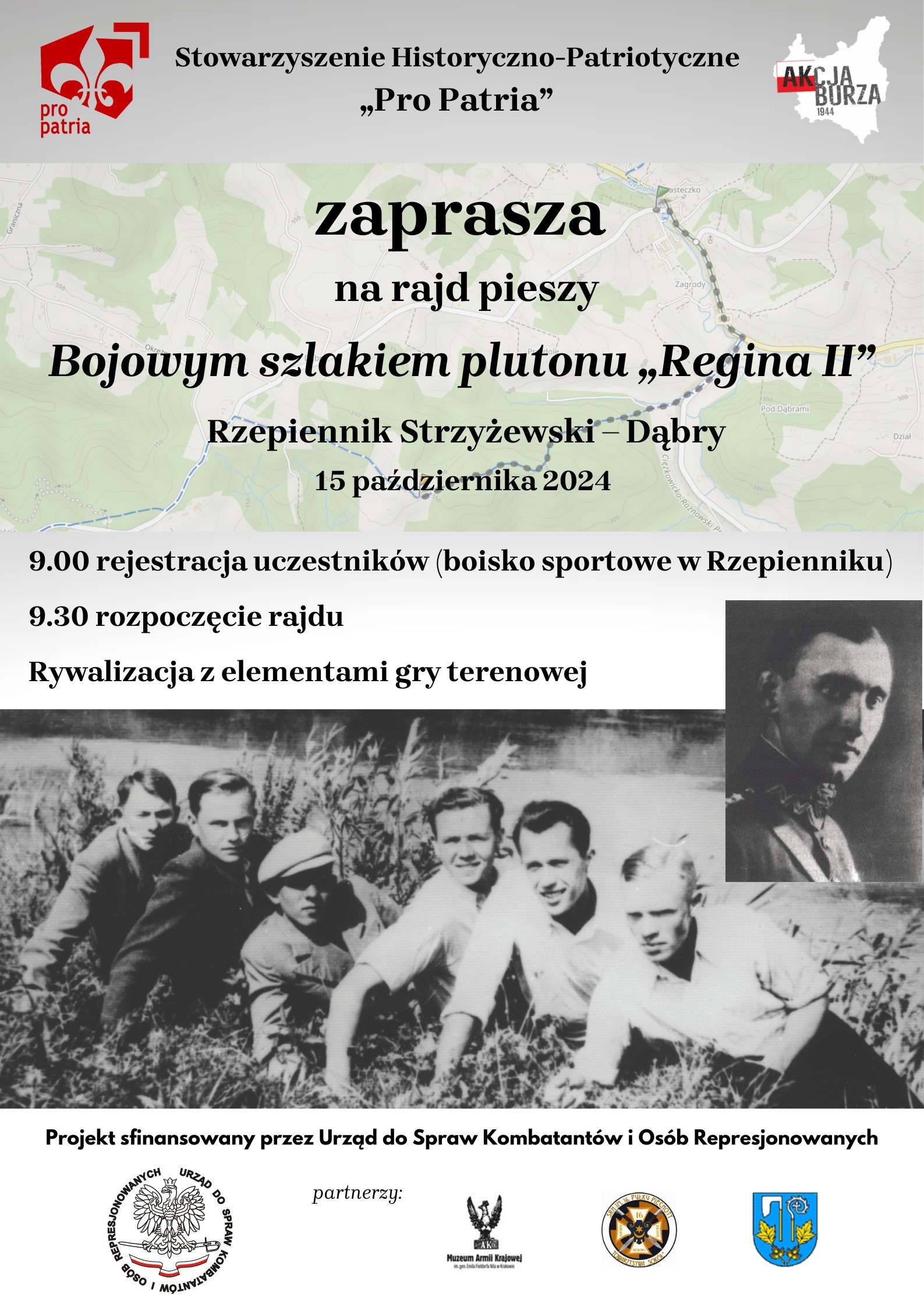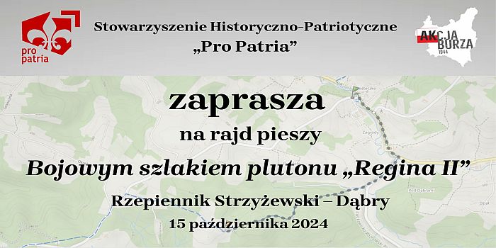 Muzeum AK w Krakowie oraz Stowarzyszenie Historyczno-Patriotyczne "Pro Patria" zapraszają we wtorek 15 października 2024 r. na rajd pieszy "Bojowym szlakiem plutonu >>Regina II<< na Dąbry".
