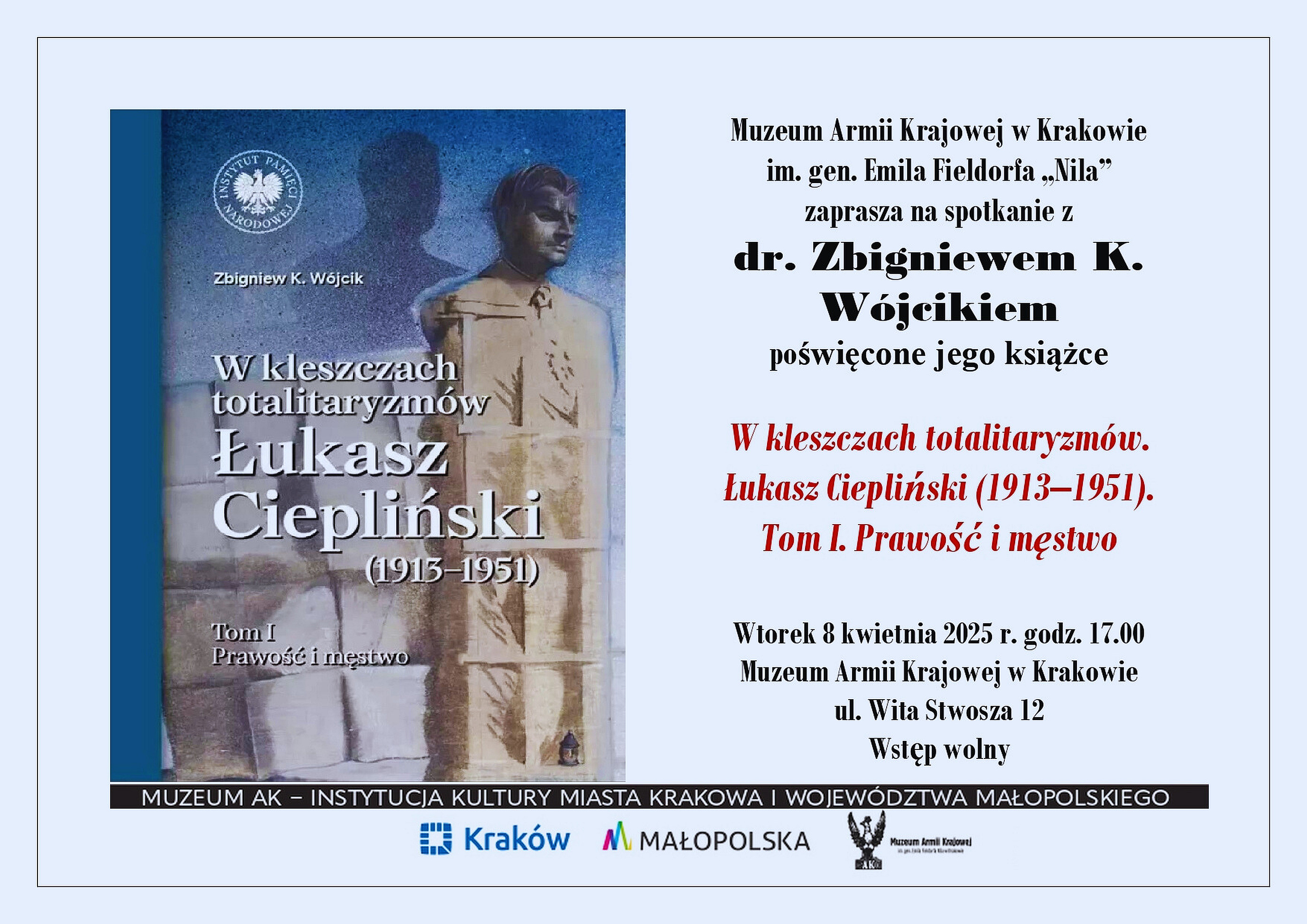 W najbliższy wtorek 8 kwietnia 2025 r. Muzeum AK zaprasza na spotkanie z dr. Zbigniewem K. Wójcikiem, autorem pierwszego tomu najnowszej biografii ppłk. Łukasza Cieplińskiego zatytułowanej "W kleszczach totalitaryzmu. Łukasz Ciepliński (1913-1951)".