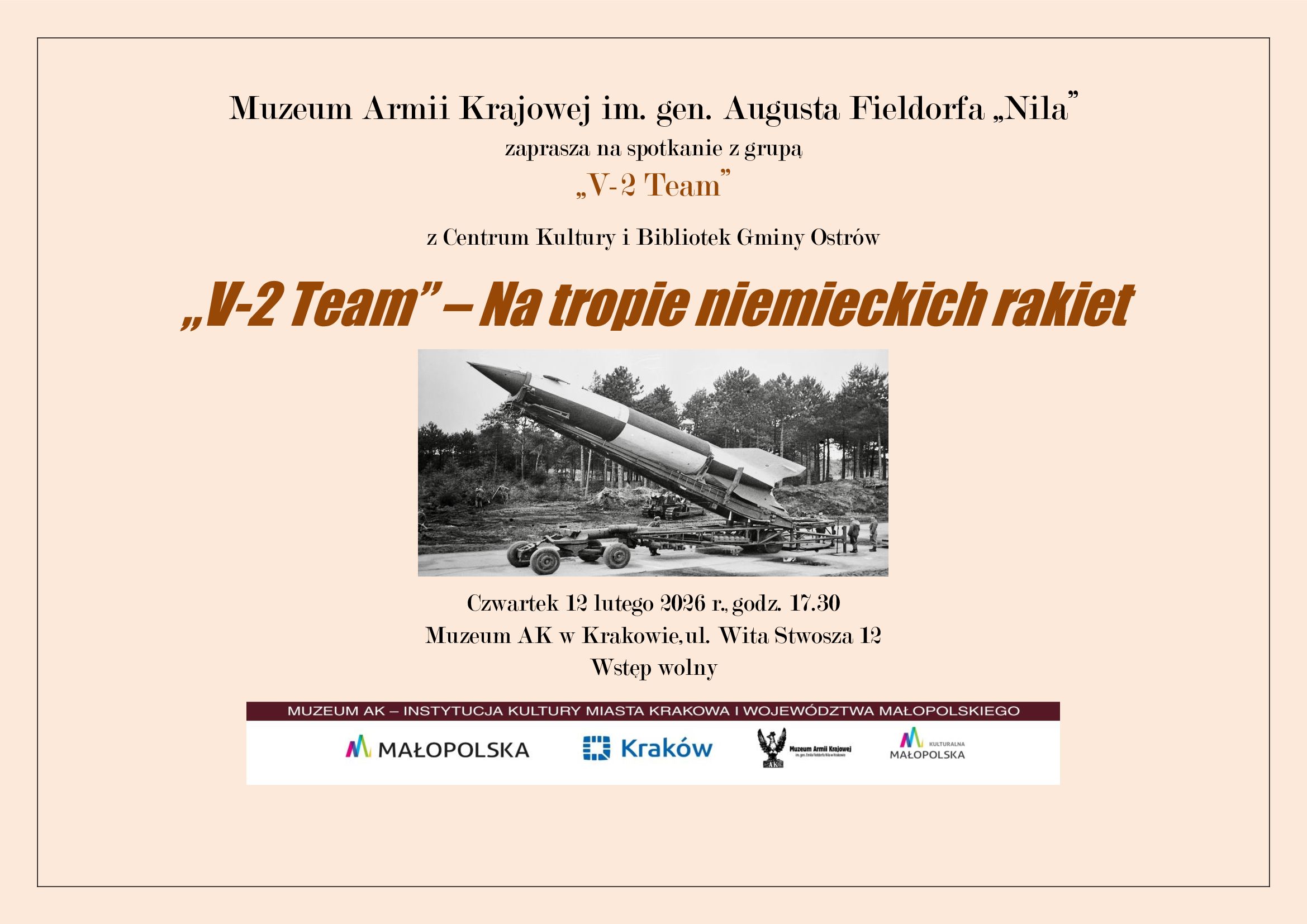 O okolicznościach tego wydarzenia, historii niemieckiej broni rakietowej, a także o innych poszukiwaniach opowiedzą na czwartkowym spotkaniu członkowie Klubu Historyczno-Eksploracyjnego "V-2 Team" z Ostrowa pod koło Ropczyc.