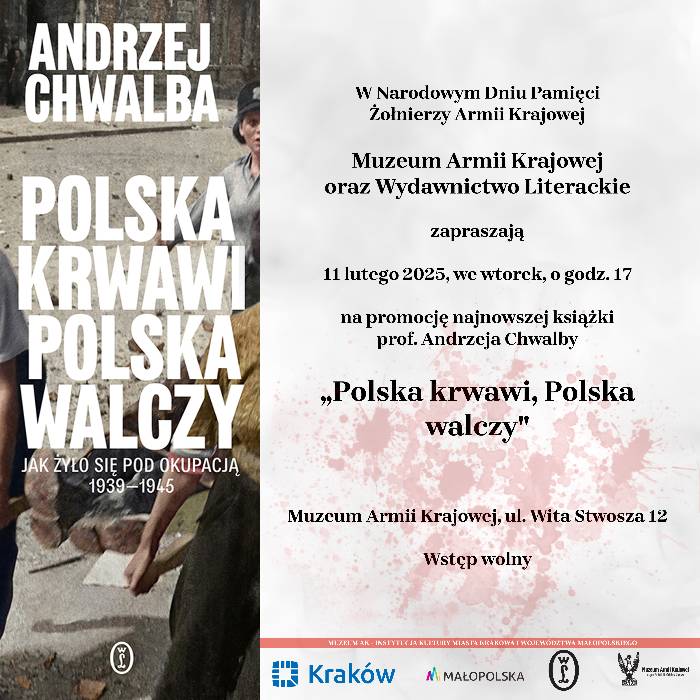 W najbliższy wtorek 11 lutego 2025 r. o godz. 17 zapraszamy do Muzeum Armii Krajowej na spotkanie autorskie z prof. Andrzejem Chwalbą poświęcone jego książce "Polska krwawi, Polska walczy".
