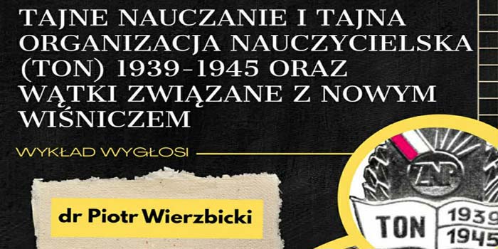 Towarzystwo Miłośników Wiśnicza zaprasza na wykład z cyklu "Wiśnicz jakiego nie znamy 2025". Tym razem uczestnicy poznają jeden z najważniejszych, a wciąż mało znanych aspektów historii okresu okupacji niemieckiej - tajne nauczanie oraz działalność Tajnej Organizacji Nauczycielskiej (TON) w latach 1939-1945, ze szczególnym uwzględnieniem wątków związanych z Nowym Wiśniczem.
