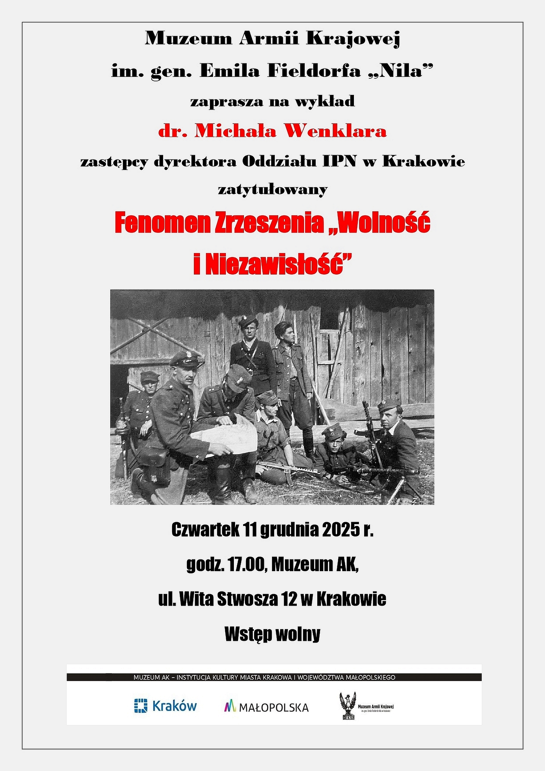 W czwartek 11 grudnia 2025 r. o godz. 17 Muzeum Armii Krajowej zaprasza na wykład dr. Michała Wenklara z krakowskiego oddziału Instytutu Pamięci Narodowej pt. "Fenomen Zrzeszenia Wolność i Niezawisłość".