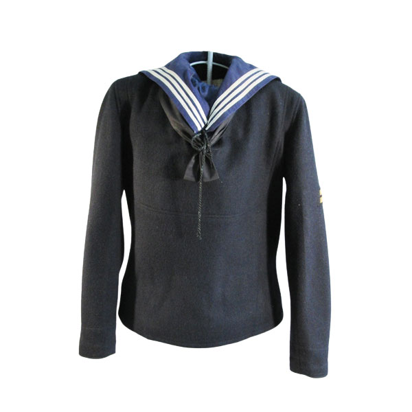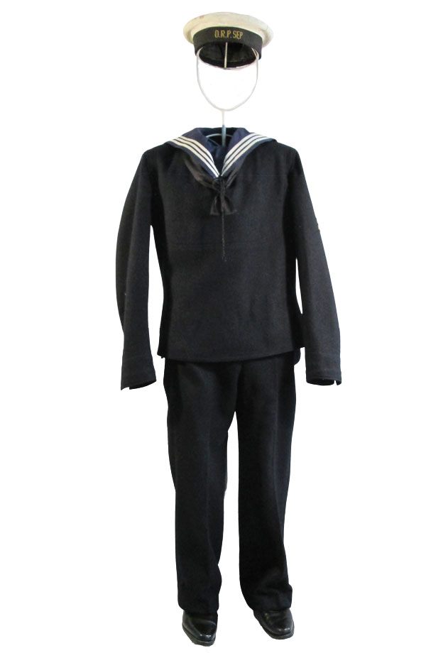 Mundur marynarski. Składa się z 4 obiektów inwentarzowych: czapka marynarska ORP "Sęp" (235); bluza marynarska mata (236); spodnie marynarskie (237); półbuty skórzane (238). Bluza marynarska mata: na lewym rękawie stopień mata.