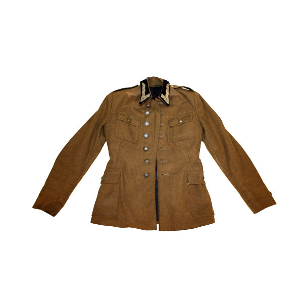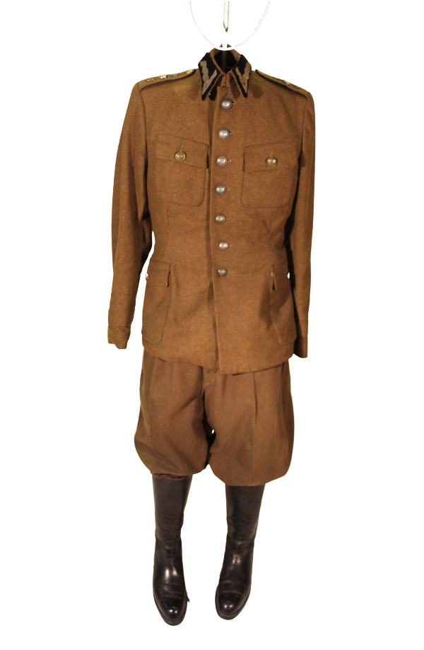 Mundur żołnierza I Dywizji im. T. Kościuszki. Składa się z 8 obiektów inwentarzowych: kurtka garnizonowa kapitana łączności (634); spodnie do długich butów - bryczesy (635); buty oficerki (636); pas główny z koalicyjką (637); kabura brązowa skórzana (638); mapnik (639); mapa "Polacy na frontach II wojny światowej 1939-1945", Warszawa 1968 r. włożona do mapnika (640); lornetka Neuhöfer K.U.K Hof-optiker Kohlmarkt 8, Wien (641). Kurtka garnizonowa: naramienniki z trzema gwiazdkami – kombinowane, guziki z orłem w koronie; na kołnierzu łapki: czarna z wężykiem oficerskim i niebieska wypustką; kurtka jednorzędowa zapinana na 7 guzików z okresu PRL; przy dolnych kieszeniach i mankietach rękawów guziki wz. 28; przy górnej kieszeni guzik wz. 43 kurica; podszewka ciemna.