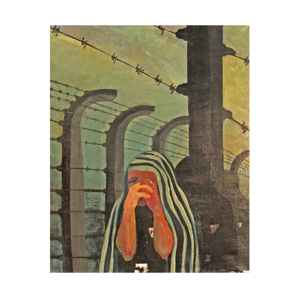 Obraz, Dobromiła Olewicz, brak tytułu, [Więźniarka na tle drutów obozu koncentracyjnego], 1988, olej na płótnie.
