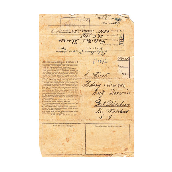 Postkarte Bolesław Kowacz KL Dachau do Jadwiga Kowacz