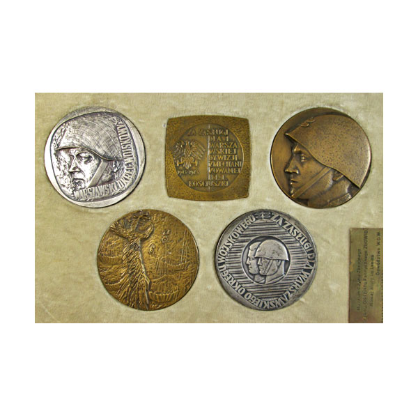 Pudełko Warszawski Okręg Wojskowy na pięć medali. Tamże wewnątrz metalowa plakietka z dedykacją: Muzeum Czynu Zbrojnego Zarządu Fabrycznego ZBOWiD Nowej Huty im. Lenina Dowództwo W.O.W., Warszawa 12.10.1973 r.