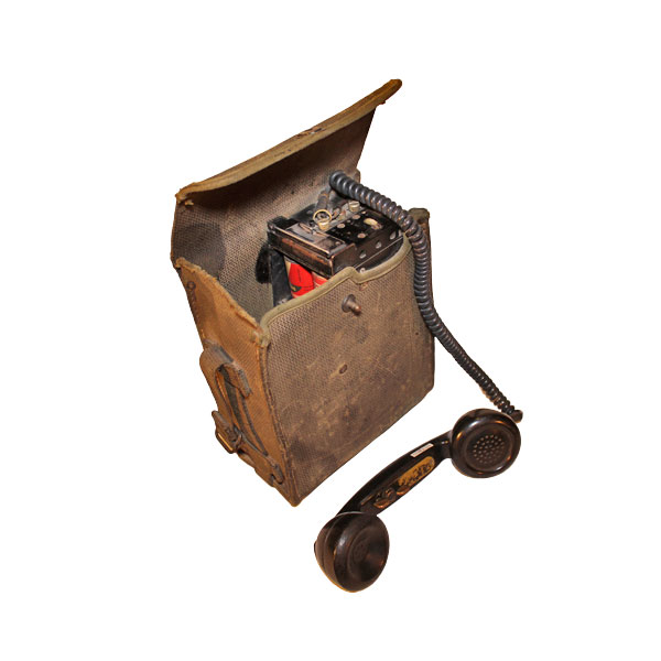 Radiotelefon ze słuchawką w brezentowym futerale.
