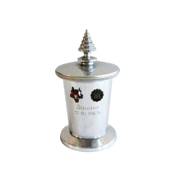Urna z ziemią z pod Lenino i miniaturami odznak ZBoWiD oraz Huta Lenina, 12.10.1967.
