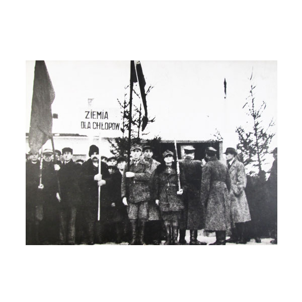 Żołnierze i grupa chłopów z tabliczką "Ziemia dla chłopów"
