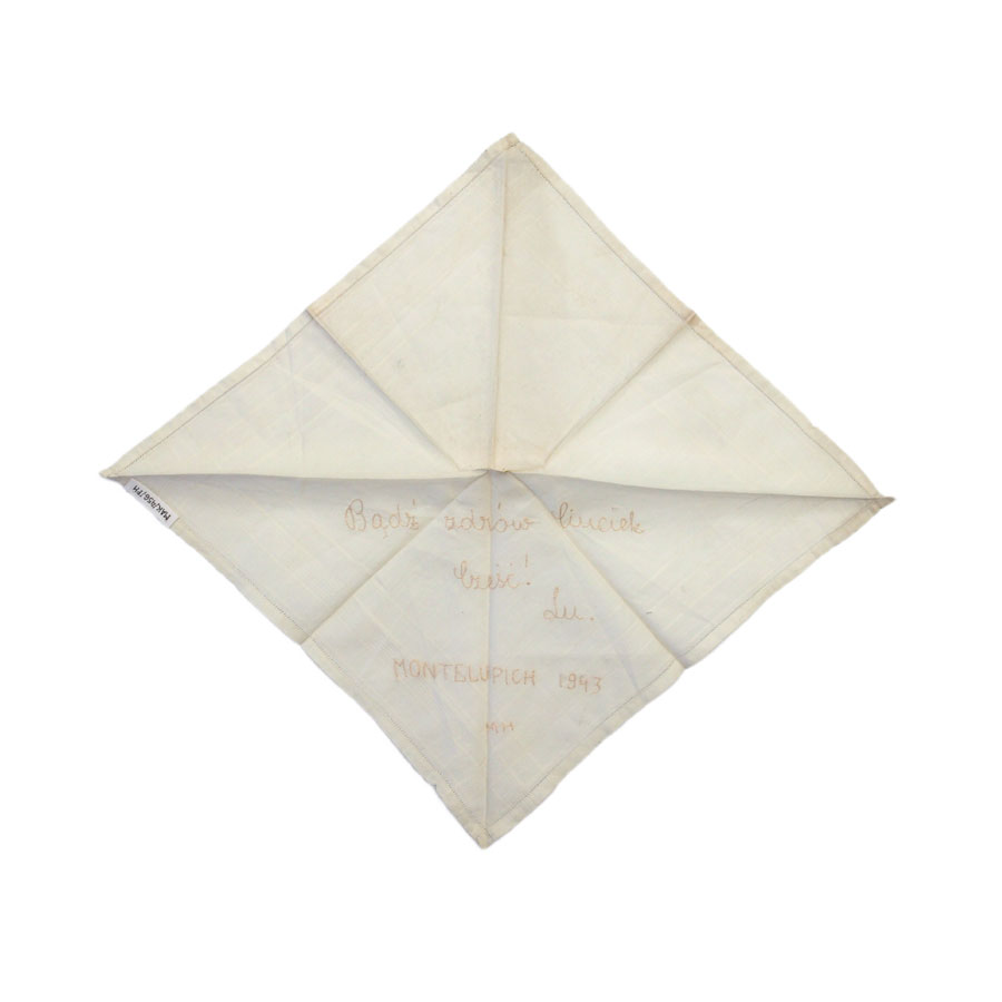 Prostokątna biała chusteczka założona i zaszyta na brzegach. W odległości 2,4 cm od krawędzi utkany fabrycznie z materiałem wzór w formie pasów z 8 prążków. Widoczny napis odręcznie haftowany bladoróżową nitką: Bądź zdrów Ciuciek Cześć! Lu. MONTELUPICH 1943 MH. Napis w 5 wierszach. Haft wykonała Helena Mytych, łączniczka ZWZ. Kobieta została aresztowana i przebywała w więzieniu przy ul. Montelupich w Krakowie w okresie od czerwca 1942 do marca 1943. Następnie została wywieziona do KL Auschwitz, gdzie zmarła (3 maja 1943, jak relacjonowała Stanisława Rachwał lub dzień później wg Sterbebücher [rejestru zgonów] KL Auschwitz).