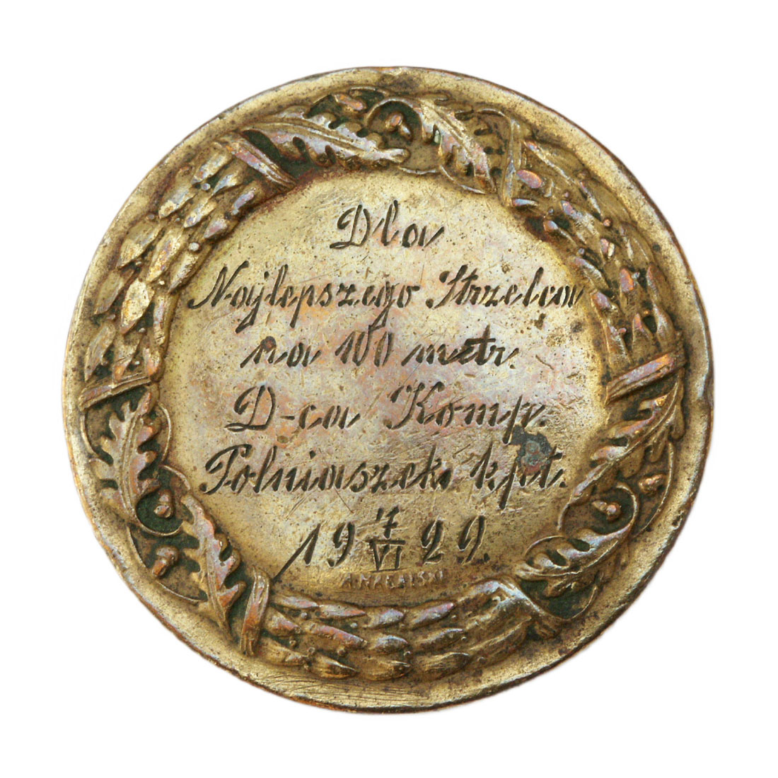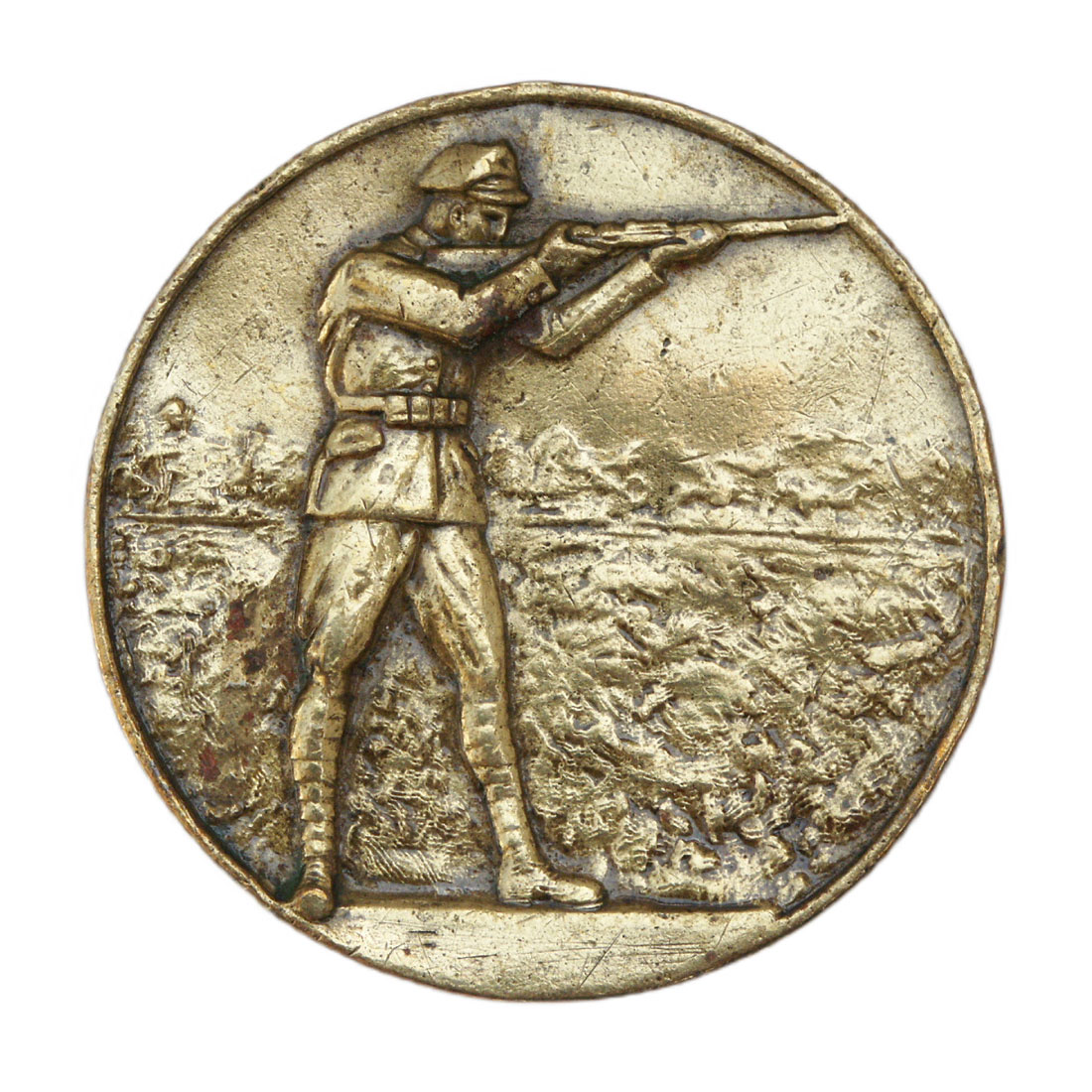 Jest przykładem wojskowego medalu sportowego, za zwycięstwo w zawodach strzeleckich. Przedstawia na awersie stojącego żołnierza w mundurze z l. 20. XX w., mierzącego z karabinu. Na rewersie, w wieńcu laurowo-dębowym, grawerowany napis, stylizowany na pismo odręczne: "Dla Najlepszego Strzelca na 100 metr. D-ca Komp. Polniaszek kpt. 7 VI 1922". Medal wybity w mosiądzu. Posiadał niezachowane uszko, służące do zawieszenia medalu na wstążce. Sposób wykonania wskazuje, że był to ogólny wzór medalu na zawody strzeleckie, a dedykacja była grawerowana dla konkretnego żołnierza.