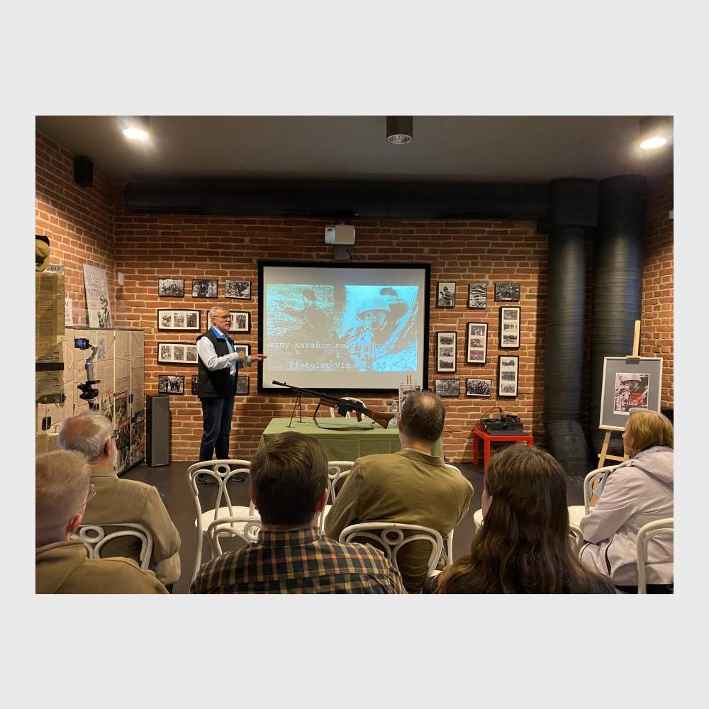 Naszym gościem był Przemysław Kosek z Małopolskiego Stowarzyszenia Strzelców i Kolekcjonerów Militariów, który przedstawił niezwykle ciekawą prelekcję o erkaemie i pistoletach Vis (te drugie pochodziły z jego zbiorów). Można było poznać okoliczności wyboru erkaemu Browning wz. 28 na uzbrojenie Wojska Polskiego w 1925 r., dowiedzieć się, dlaczego belgijski producent miał kłopoty z realizacją dostaw, jak polscy inżynierowie poradzili sobie z wadliwą dokumentacją i dlaczego Polska nie musiała uiszczać opłat licencyjnych.