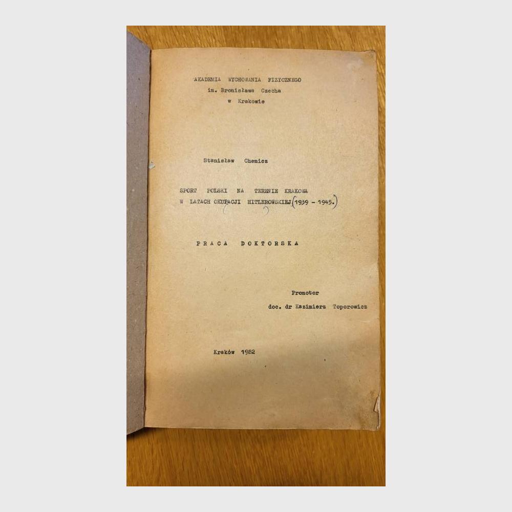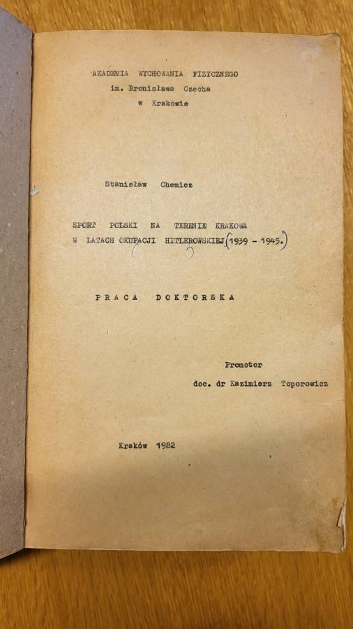 Gość przekazał nam także oryginał swojej pracy doktorskiej, napisanej w 1982 r. na Akademii Wychowania Fizycznego w Krakowie i zatytułowanej "Sport polski na terenie Krakowa w latach okupacji hitlerowskiej 1939-1945". Doktorat powstał pod opieką naukową dr. Kazimierza Toporowicza (późniejszego profesora, historyka kultury fizycznej, byłego rektora AWF).