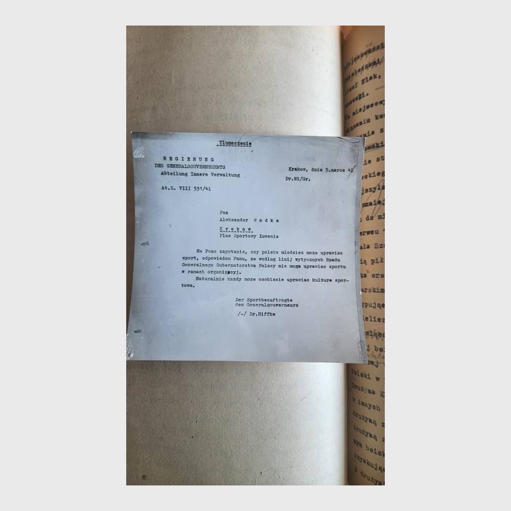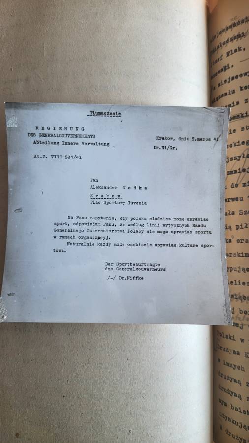 Interesujący jest dokument z 5 marca 1941 r. z odpowiedzią komisarza ds. sportu w rządzie Generalnego Gubernatorstwa skierowaną do kierownika Placu Sportowego "Juvenia", wspomnianego Aleksandra Wodki: "Na Pana zapytanie, czy polska młodzież może uprawiać sport, odpowiadam Panu, że według linii wytycznych Rządu Generalnego Gubernatorstwa Polacy nie mogą uprawiać sportu w ramach organizacji. Naturalnie każdy może osobiście uprawiać kulturę sportową"...