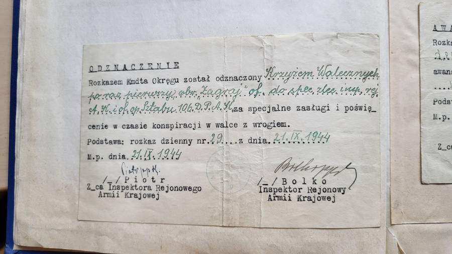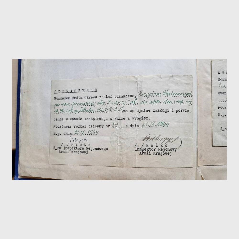 Szczególnie cenne są dokumenty pochodzące z okresu służby Wiesława Żakowskiego w Armii Krajowej. Na przykład podpisane przez dowódcę 106. Dywizji Piechoty AK ppłk. Bolesława Nieczuję-Ostrowskiego "Bolka": odznaczenie Krzyżem Walecznych z 21 września 1944 r., pochwała za wyróżniającą się służbę z 6 grudnia 1944 r. i awans na majora z 15 stycznia 1945 r.