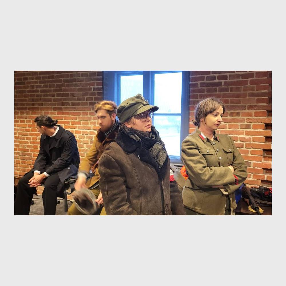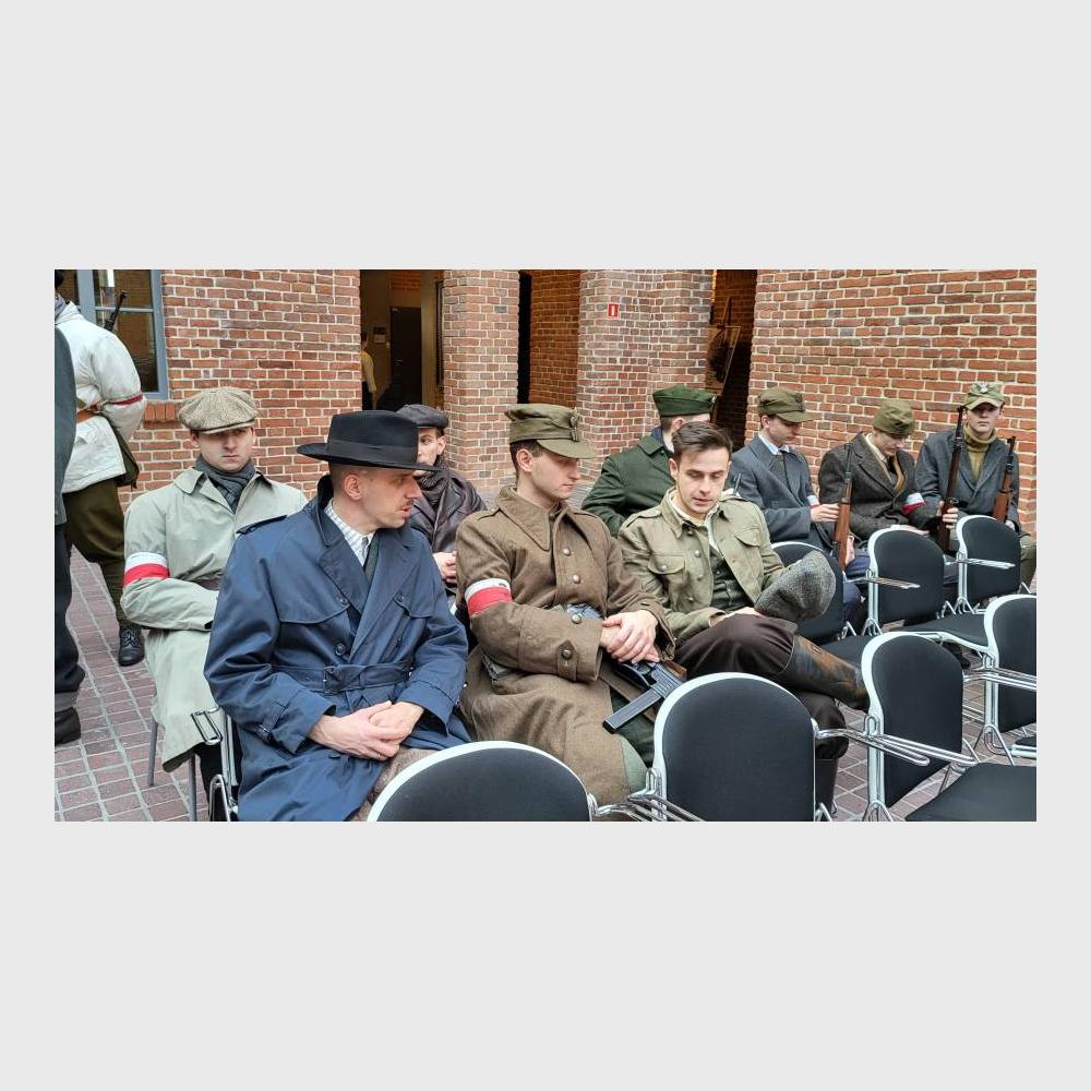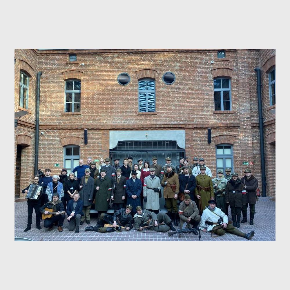 Z dworca rekonstruktorzy przemaszerowali w kolumnie do budynku naszego Muzeum przy ul. Wita Stwosza 12. Tam nakręcone zostały finałowe ujęcia, m.in. na ekspozycji głównej i pod portretem patrona - gen. Emila Fieldorfa "Nila". Całość zakończyła wspólna fotografia uczestników i ekipy wykonana na dziedzińcu. W sumie w sobotnich zdjęciach wzięło udział prawie 50 osób! Grupy rekonstrukcyjne pochodziły z różnych stron Małopolski - od Wadowic i Olkusza po Nowy Sącz i Tarnów.