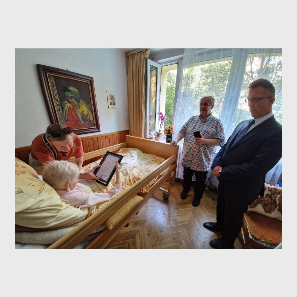 Dzień wcześniej u pani Ireny z życzeniami pojawiła się delegacja naszej placówki złożona z wicedyrektora MAK prof. Olgierda Grotta i Karola Kordasa z Działu Upowszechniania. Prof. Grott przekazał jubilatce kwiaty i okolicznościowy list z życzeniami.