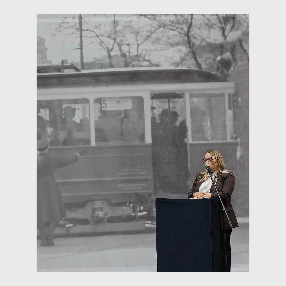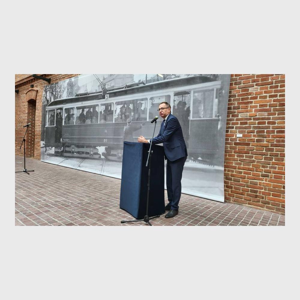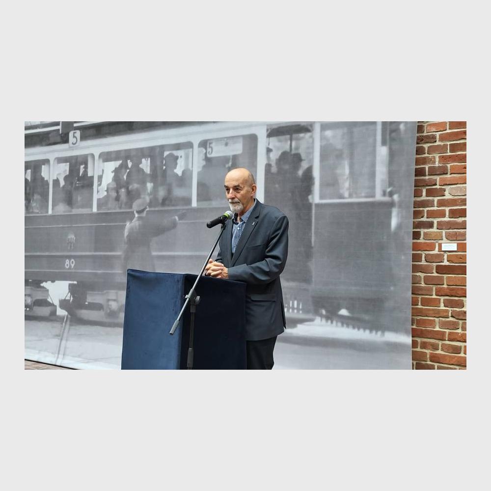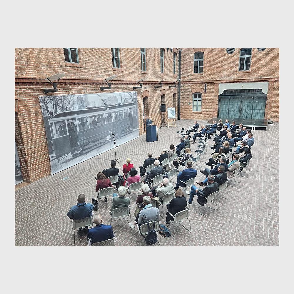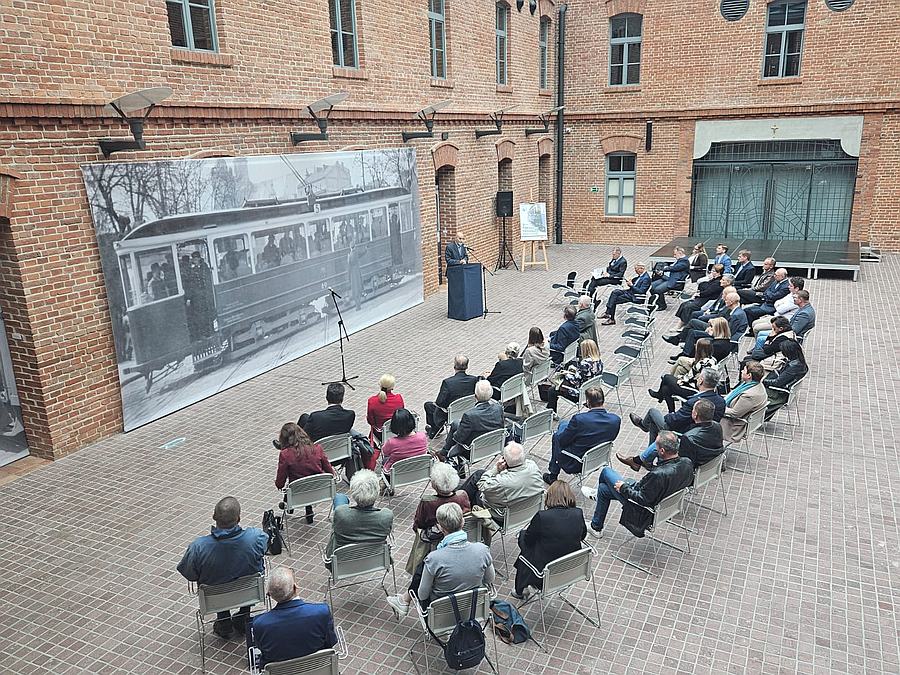 Na muzealnym dziedzińcu przed dużych rozmiarów bannerem ze zdjęciem krakowskiego tramwaju z 1941 r. zasiedli zaproszeni goście. Byli wśród nich członkowie władz Miejskiego Przedsiębiorstwa Komunikacyjnego w Krakowie, krewni bohaterów wystawy, dawni i byli pracownicy MPK, a także autorzy ekspozycji.