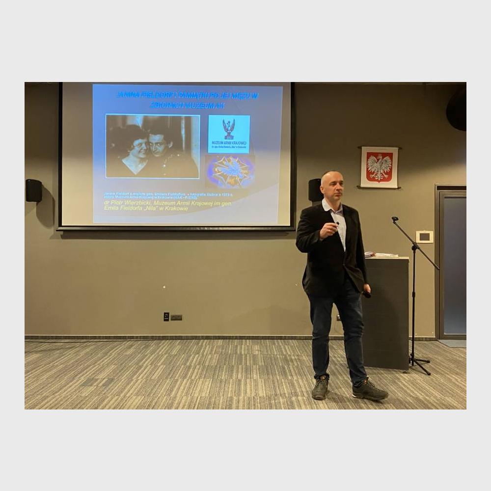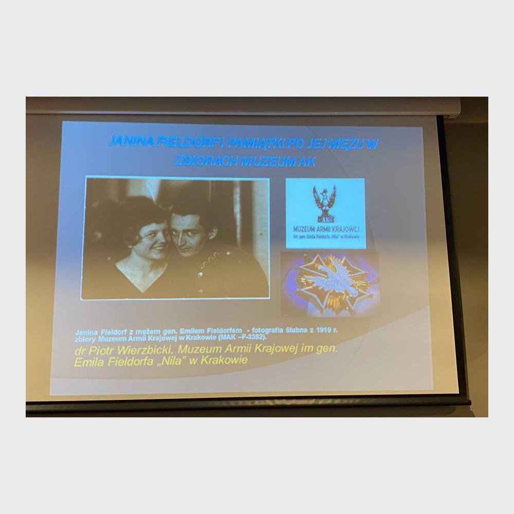 Prelekcję pt. "Janina Fieldorf i pamiątki po jej mężu w zbiorach Muzeum AK" wygłosił dr Piotr Wierzbicki z Działu Upowszechniania MAK. Prelegent przedstawił postać żony generała od jej dzieciństwa i młodości w Wilnie, przez małżeństwo z Emilem Fieldorfem w okresie międzywojennym, czas okupacji aż po powojenne losy w PRL po śmierci męża.