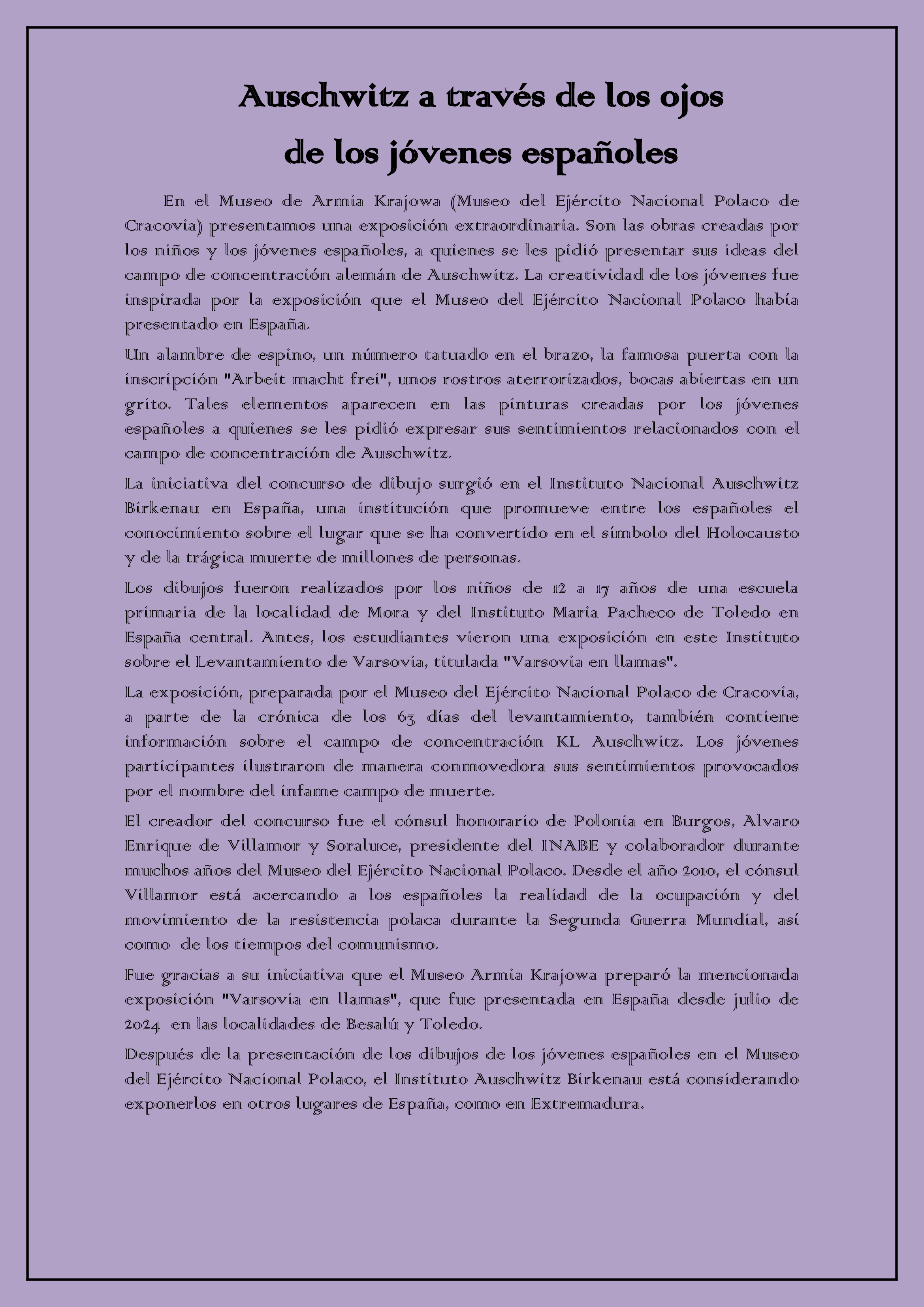 Ekspozycja "Auschwitz w oczach młodych Hiszpanów" to rysunki wykonane przez hiszpańskie dzieci i młodzież poproszone o przedstawienie ich wyobrażenia niemieckiego obozu koncentracyjnego Auschwitz. Twórczość młodych ludzi inspirowana była wystawą, którą Muzeum